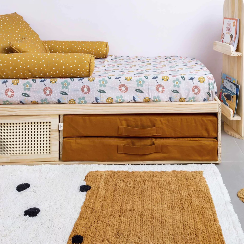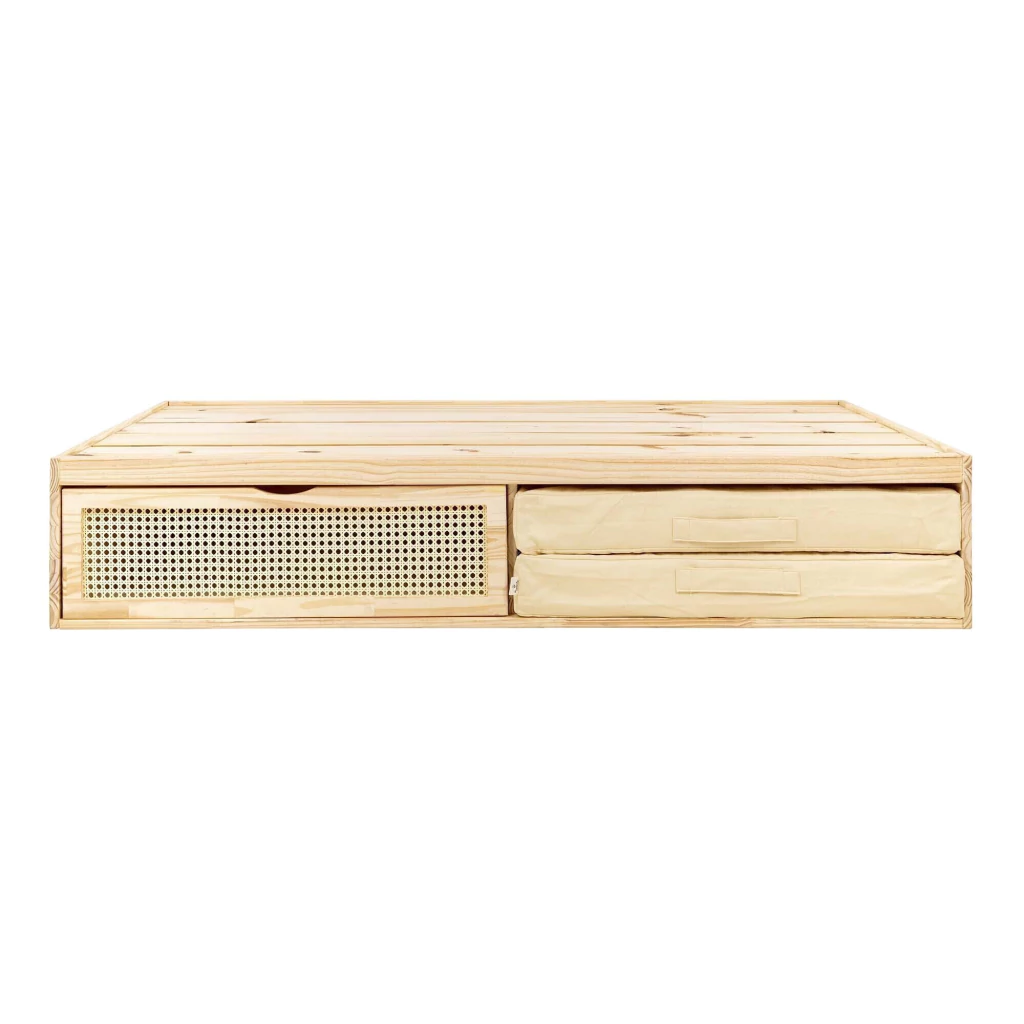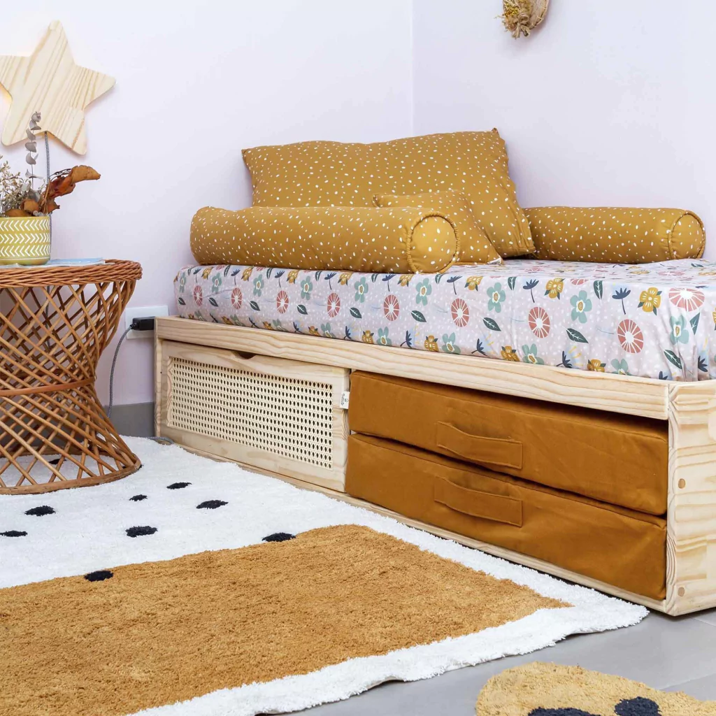 A Cama Lótus em pinus otimiza o espaço do quarto infantil com seu gaveteiro que pode ser utilizado para guardar brinquedos ou enxovais. O futon dobrável garante o conforto das visitas e conta com capa removível e lavável.