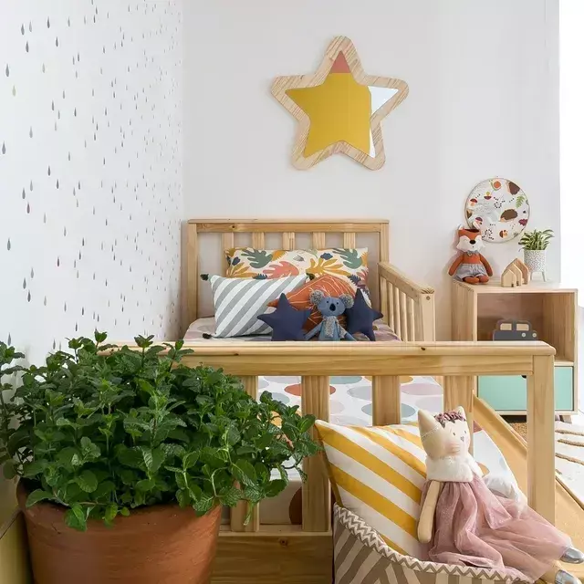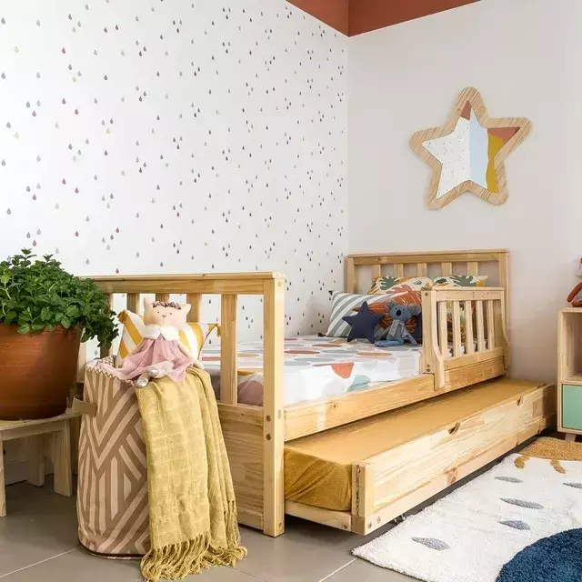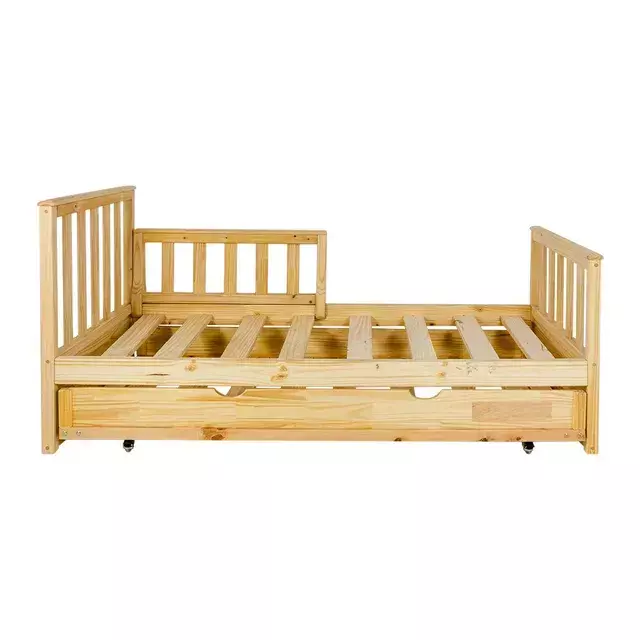 Cama com cama auxiliar confeccionadas em madeira maciça Pinus com cabeceira e peseira mais altas, gradeadas. Acompanha 1 grade lateral removível de encaixe.
