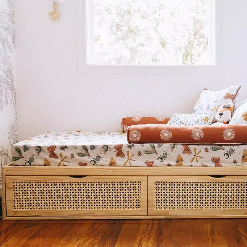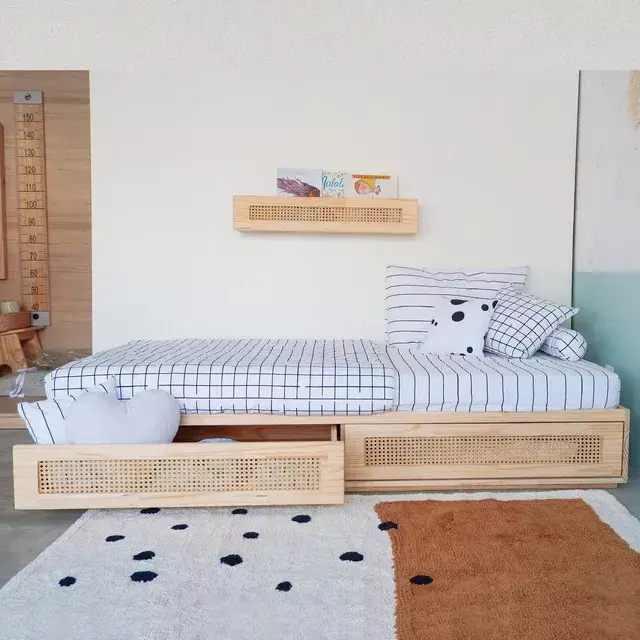 Cama com gaveteiro, feita em madeira pinus com detalhes em palha sextavada.