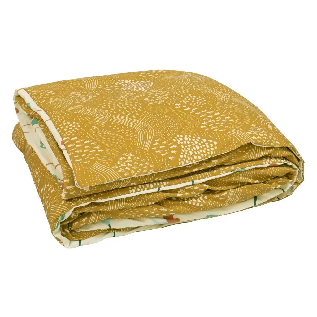Capa de edredom dupla face nas estampas Caatinga e Cajueiro. Tecido 100% algodão hipoalergênico no tamanho solteiro.