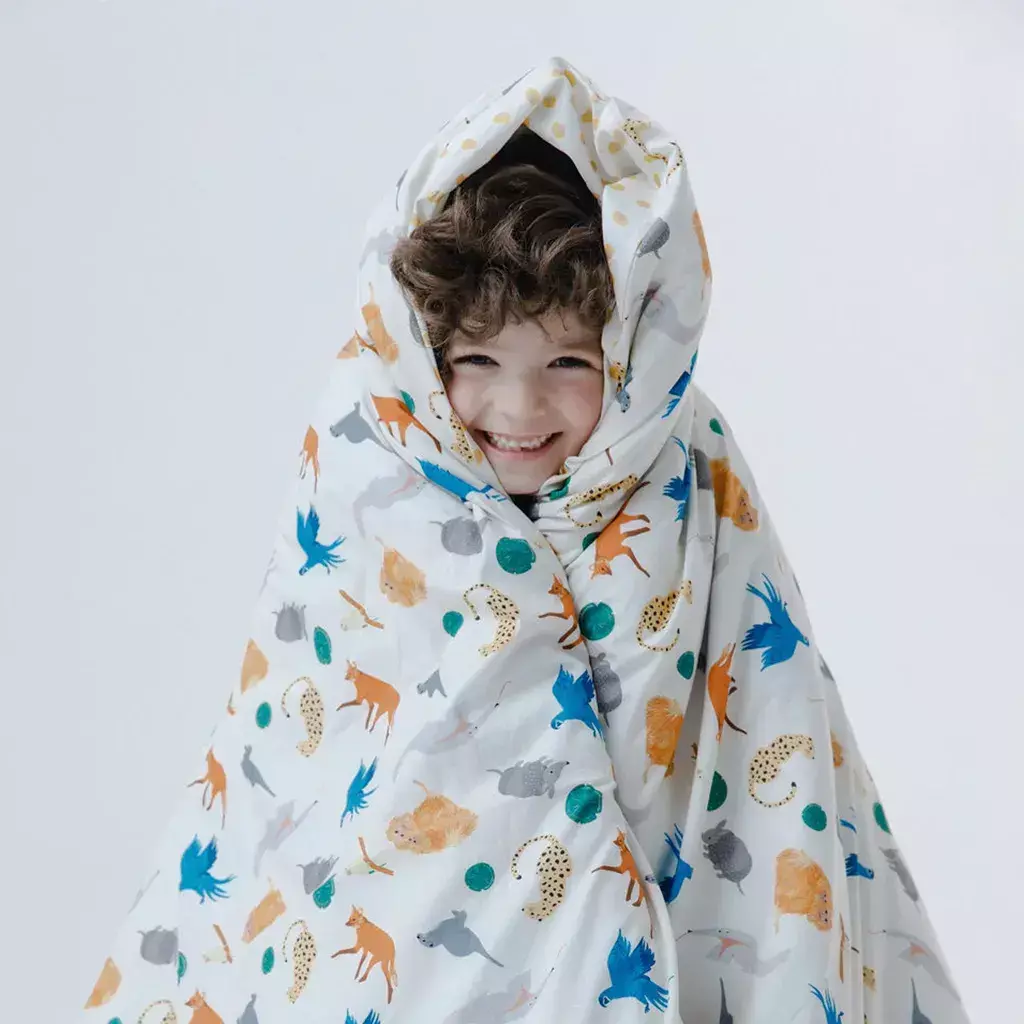 Capa de edredom dupla face nas estampas Dona Onça e Somos Todos Bichos. Tecido 100% algodão hipoalergênico no tamanho solteiro.