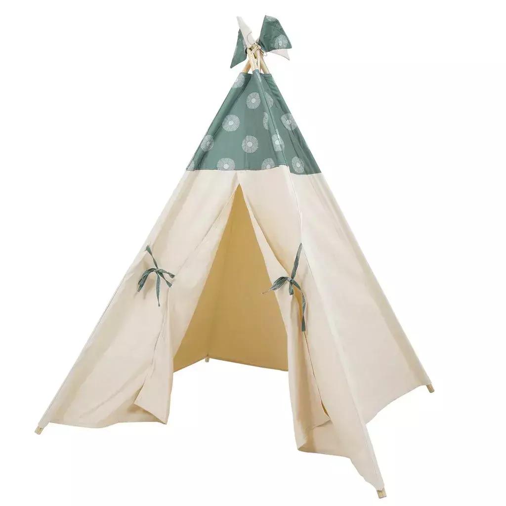 Cabana de algodão, 4 hastes de madeira de reflorestamento, 4 banderinhas superiores. Acompanha 6 bandeirinhas no total para escolher a sua combinação.