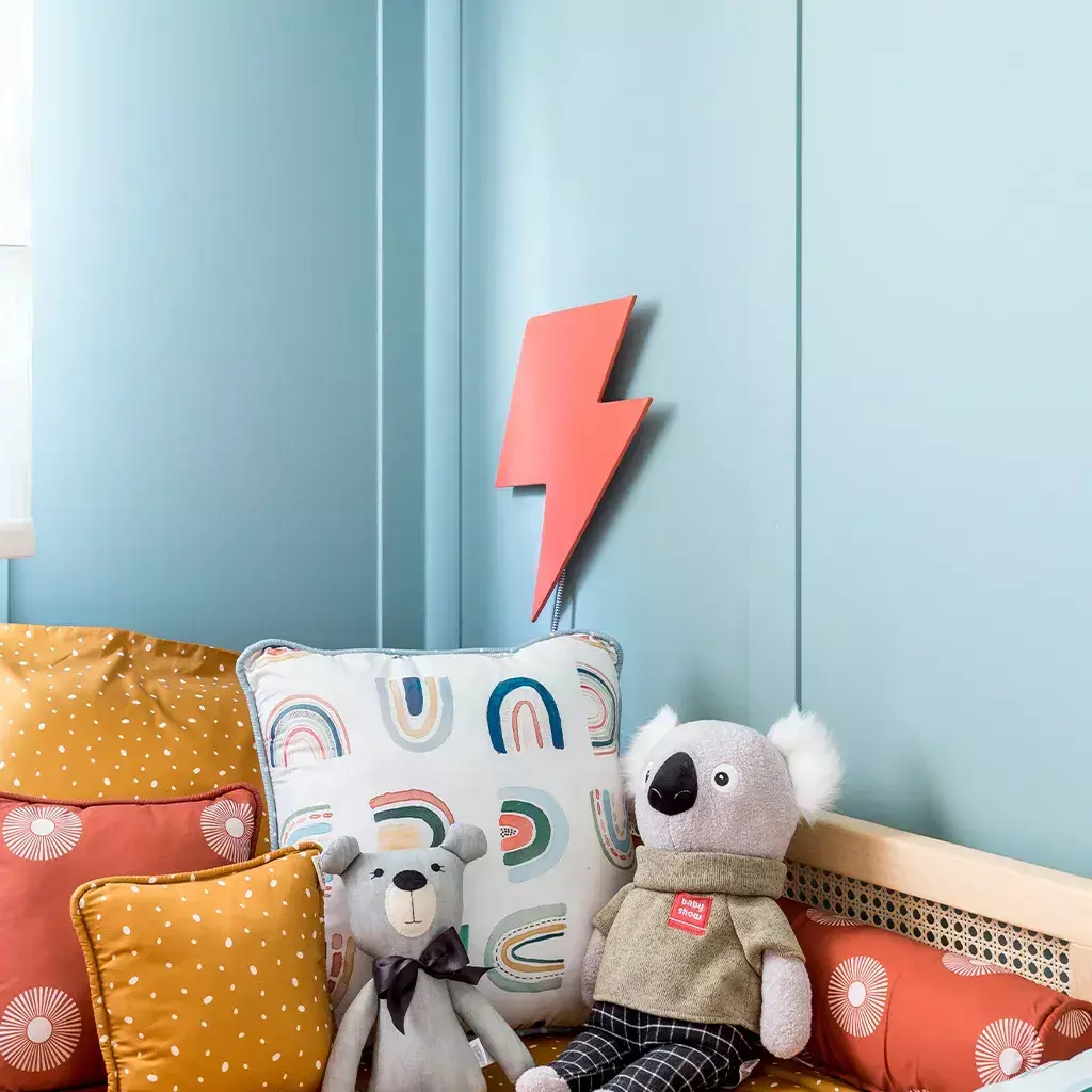 Luminária noturna com luz LED. A peça carrega em si um elemento lúdico que interage com as crianças: para acender e apagar, não se utiliza um interruptor convencional. O fio aciona a luminária ao ser puxado!