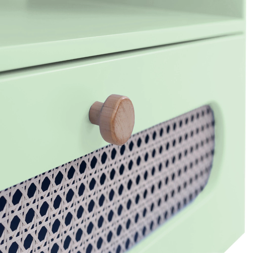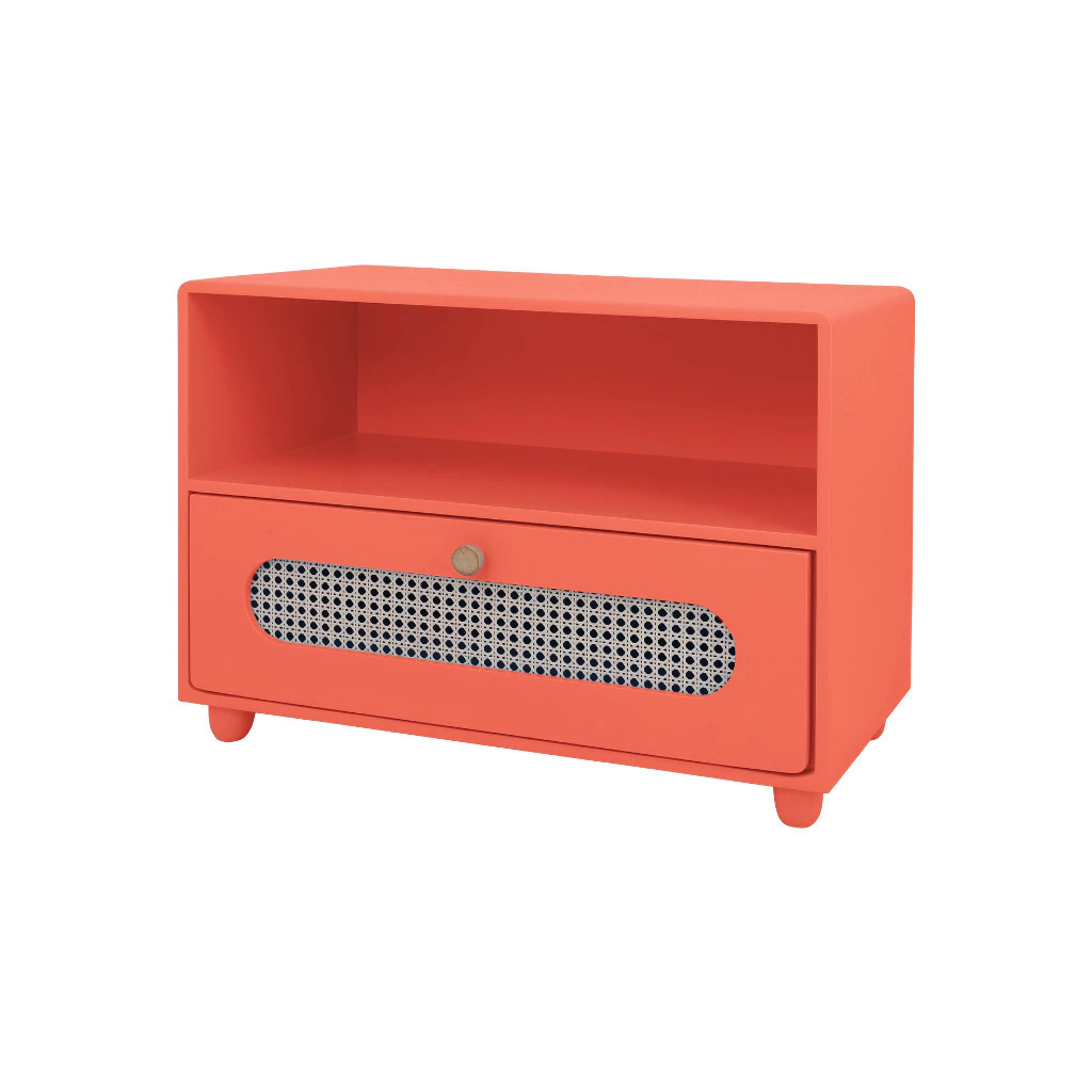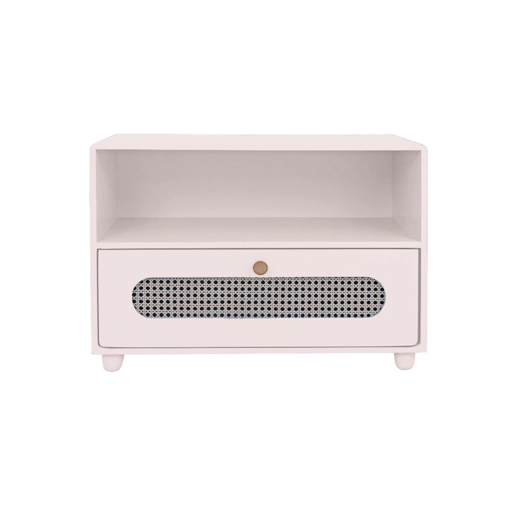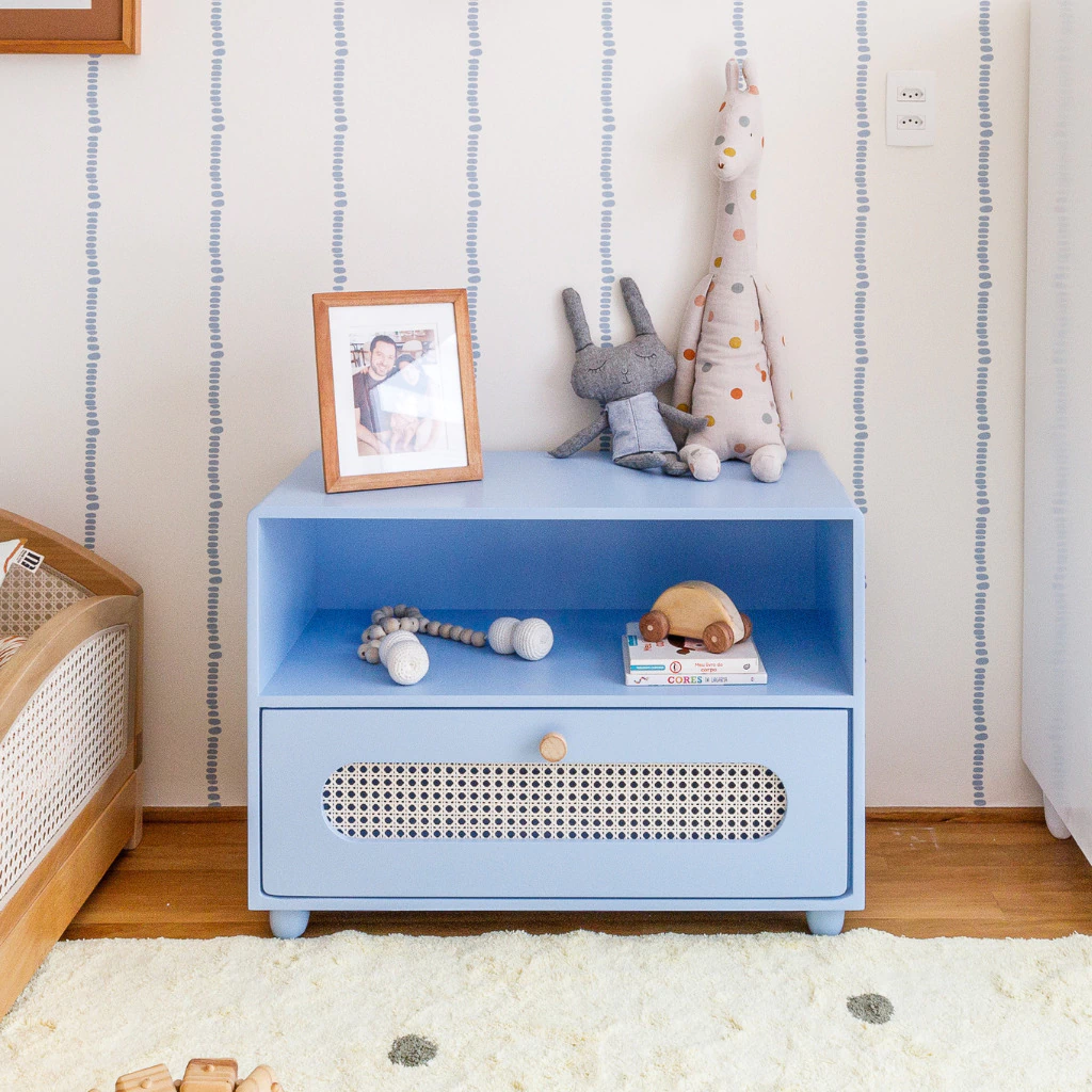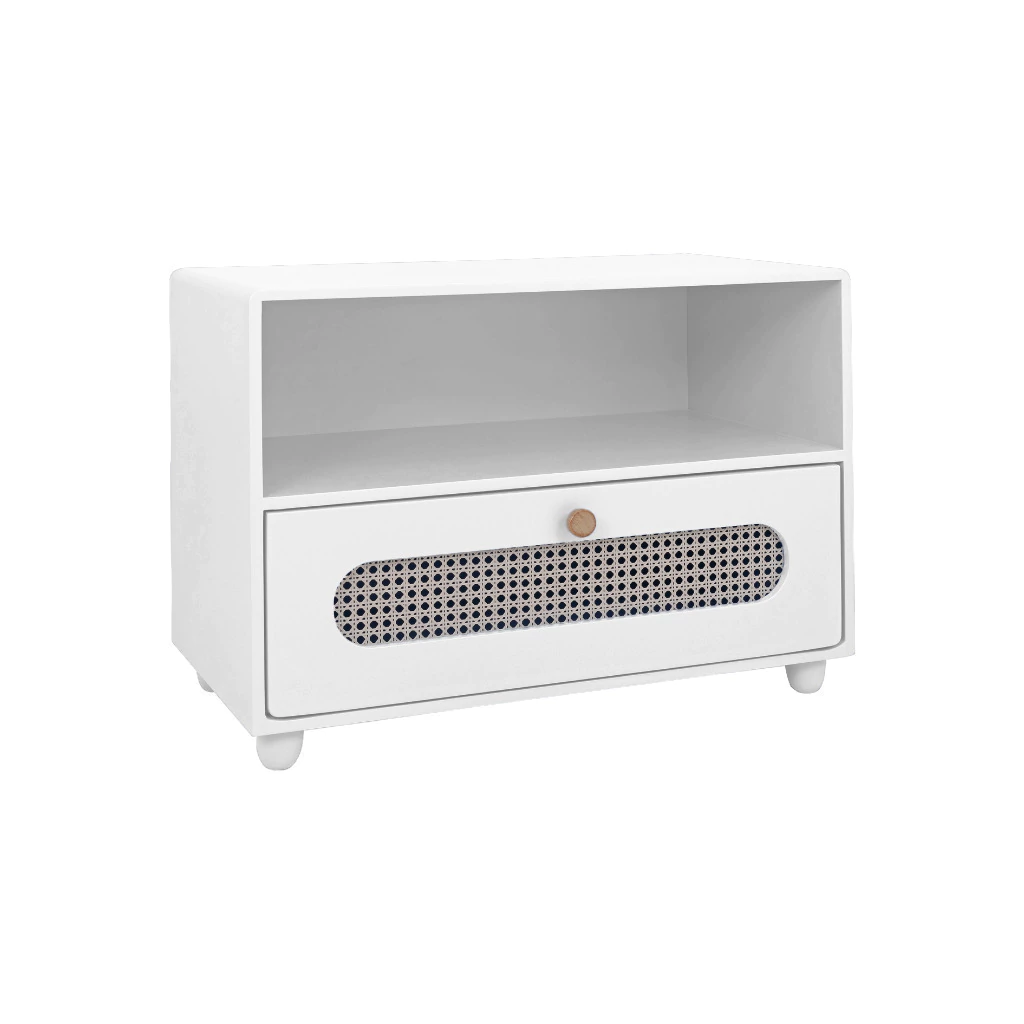 Mesinha de cabeceira com acabamento laqueado, nicho e gaveta com detalhe em palha sextavada.