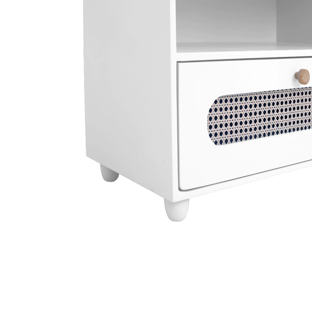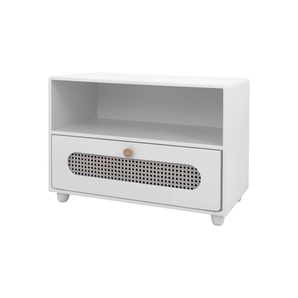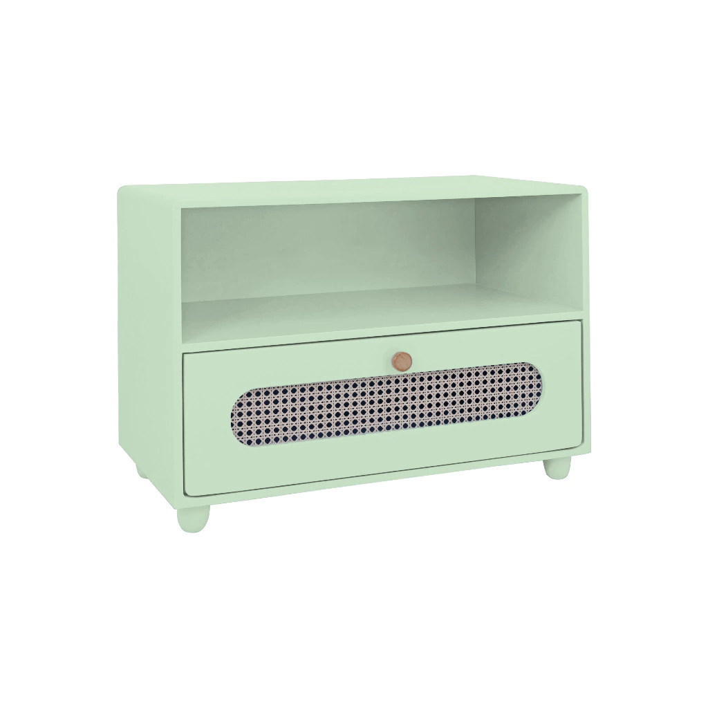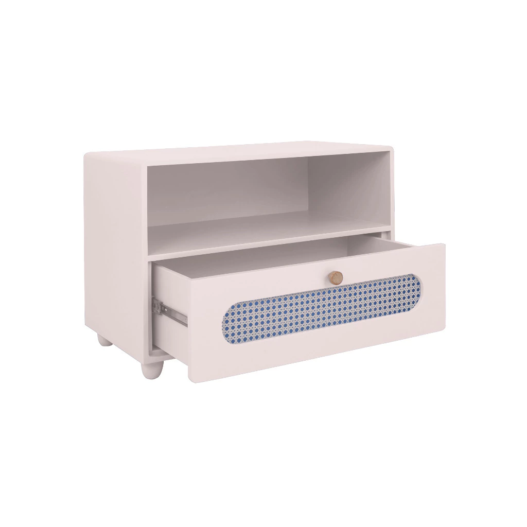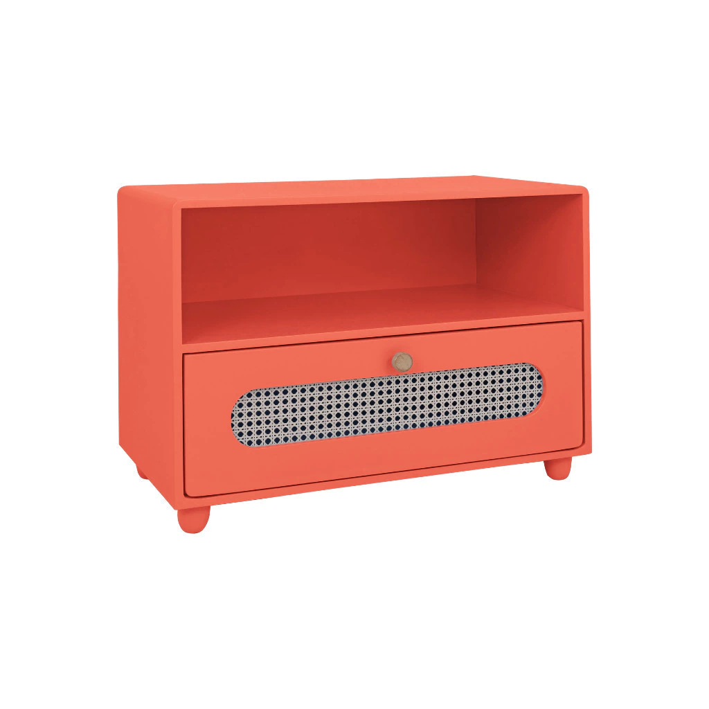 Mesinha de cabeceira com acabamento laqueado, nicho e gaveta com detalhe em palha sextavada.