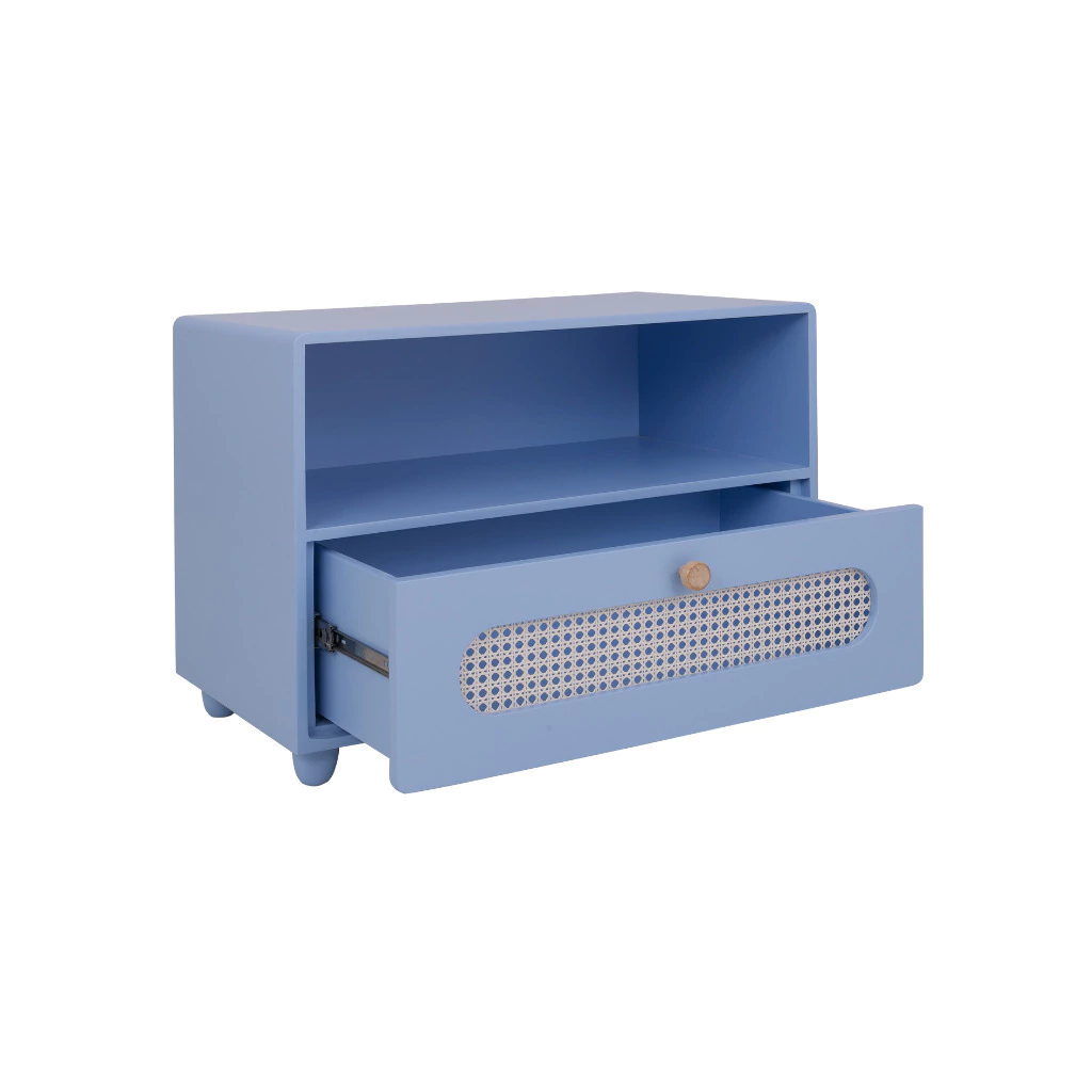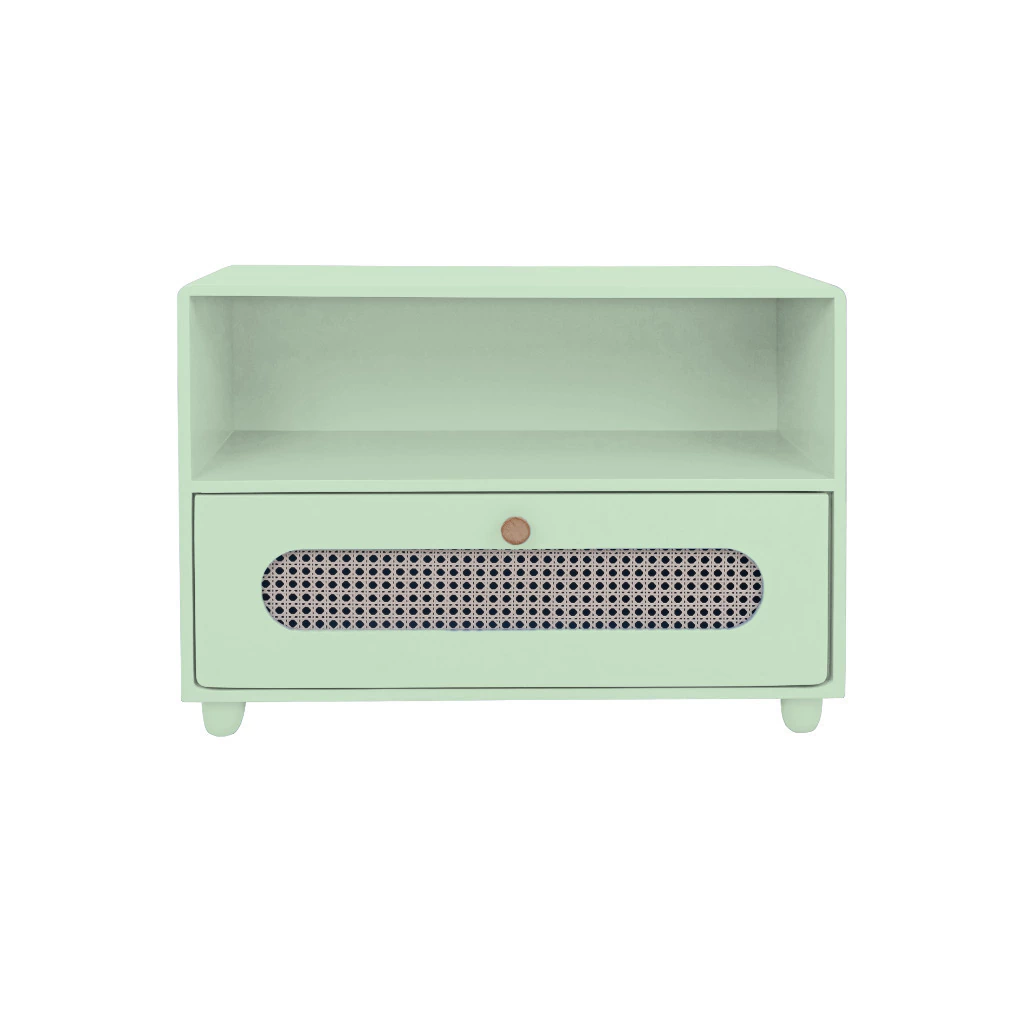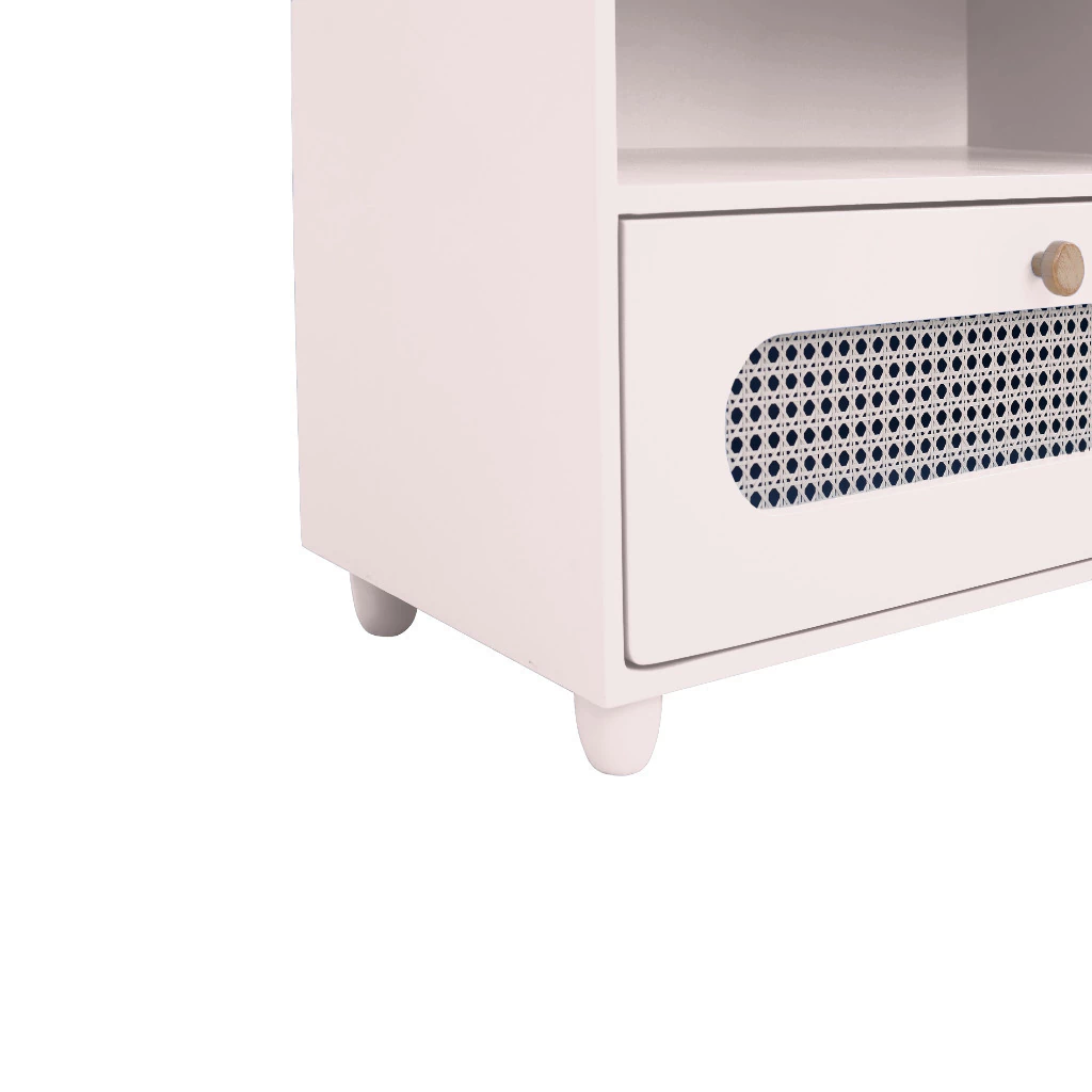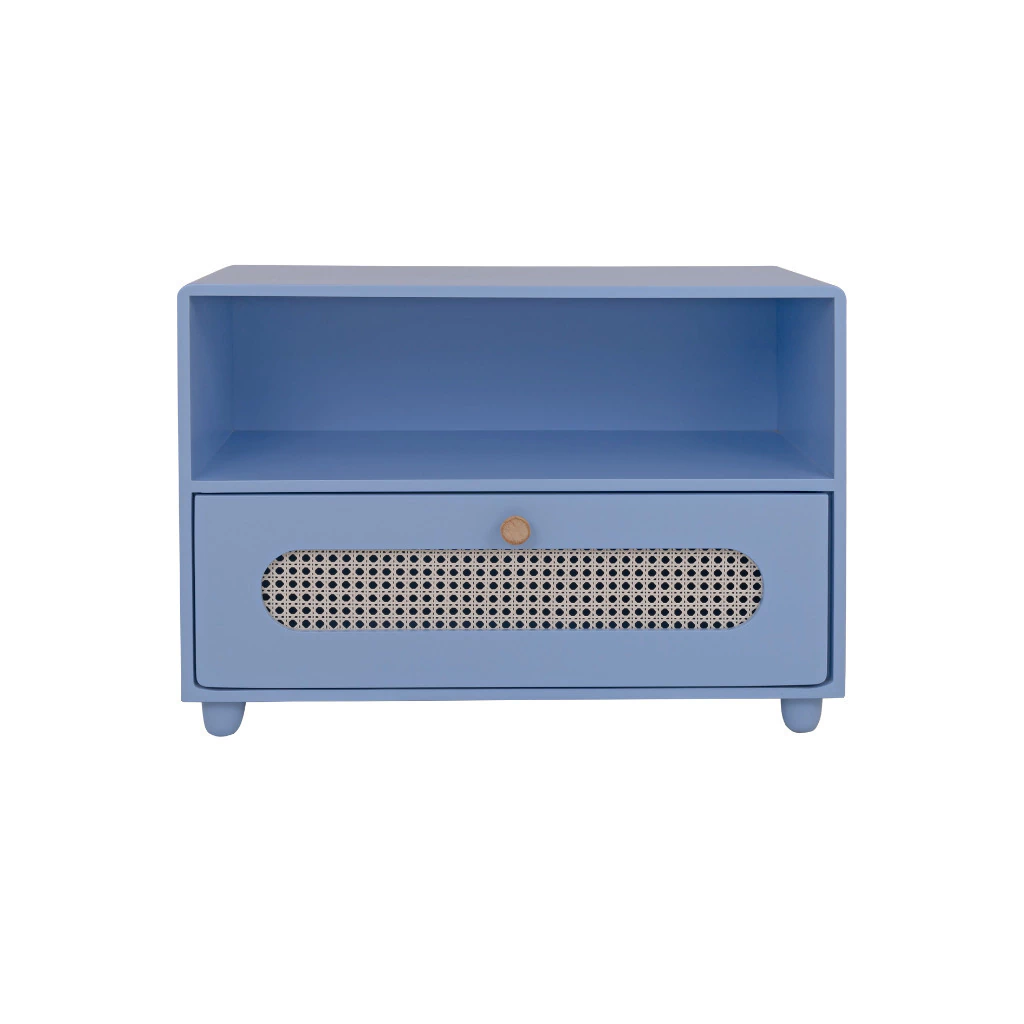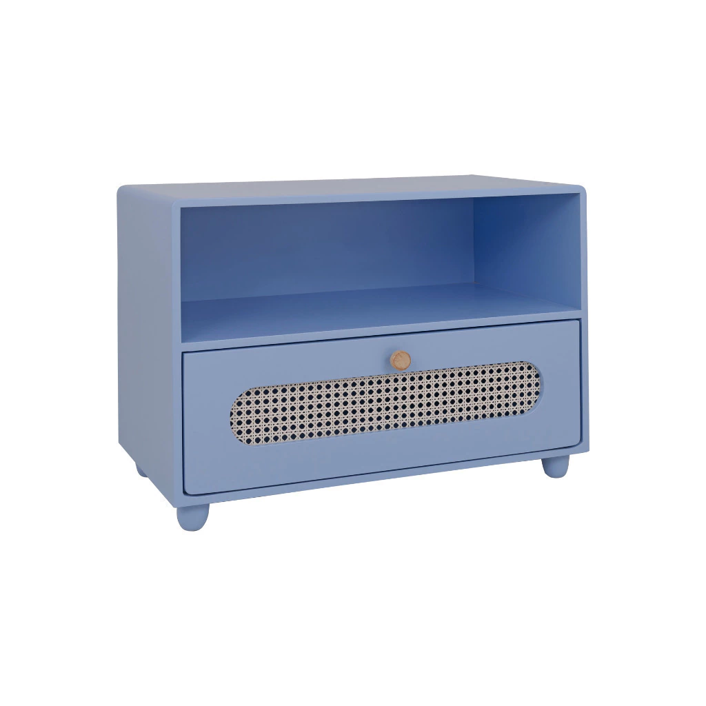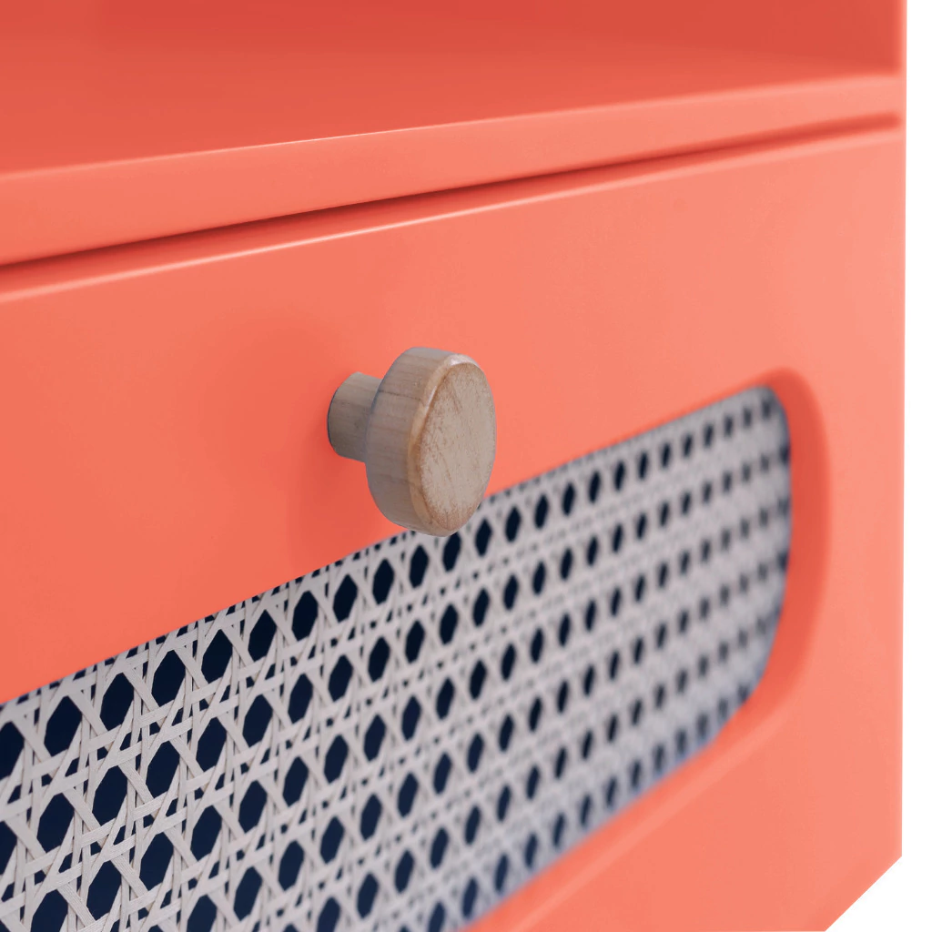 Mesinha de cabeceira com acabamento laqueado, nicho e gaveta com detalhe em palha sextavada.