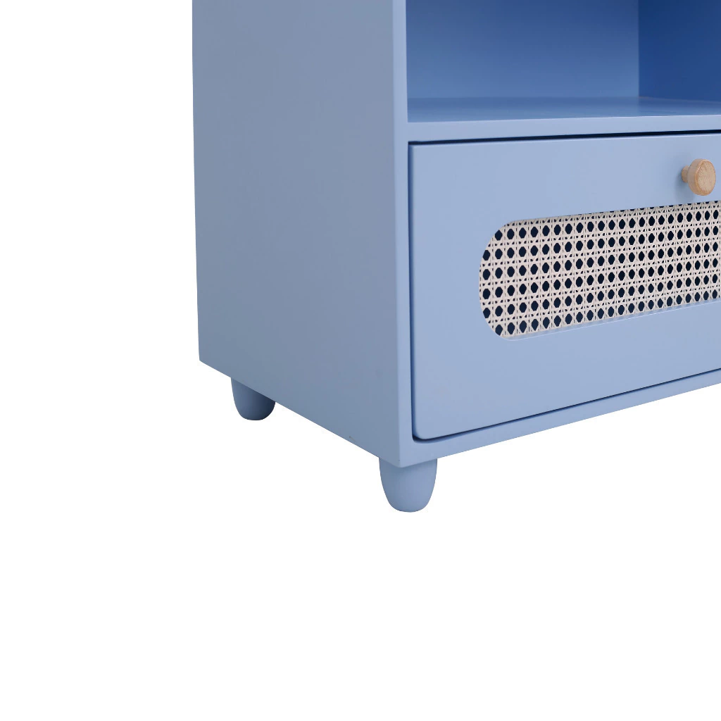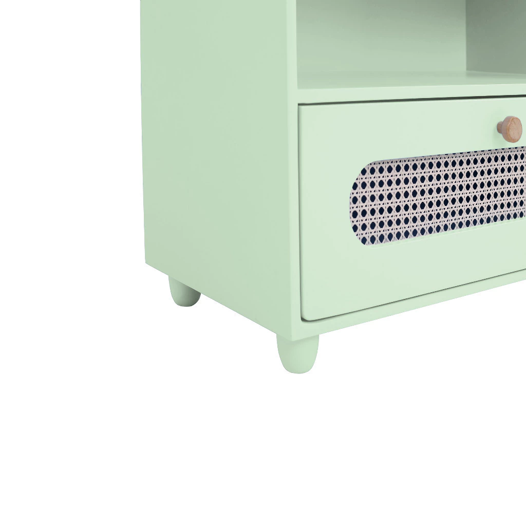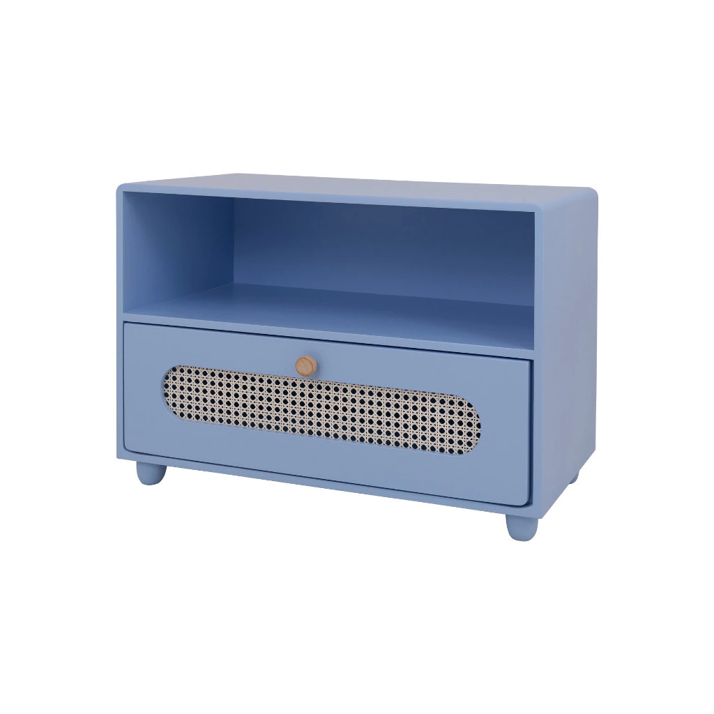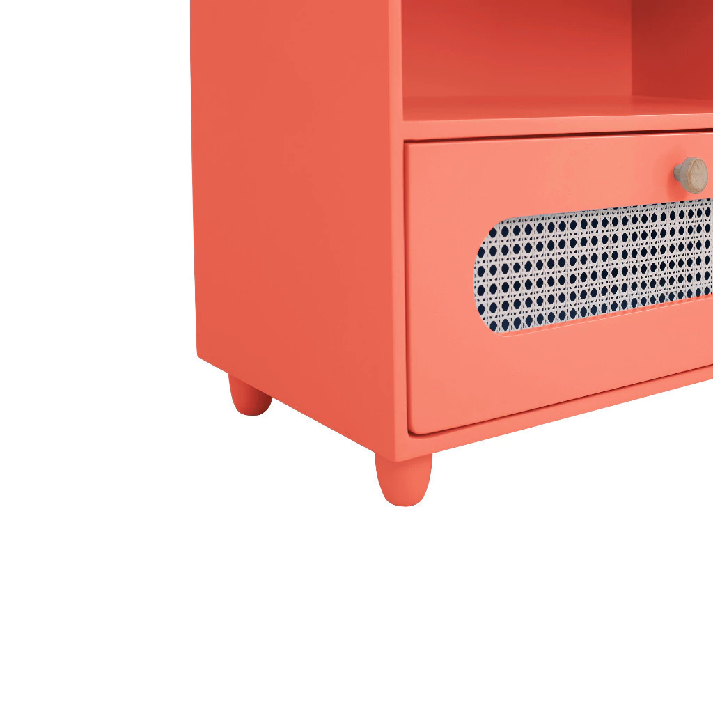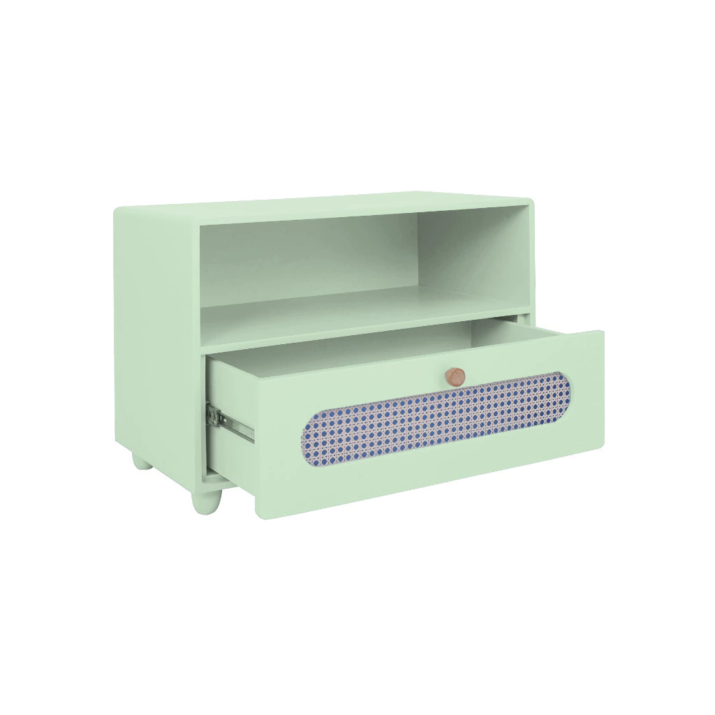 Mesinha de cabeceira com acabamento laqueado, nicho e gaveta com detalhe em palha sextavada.