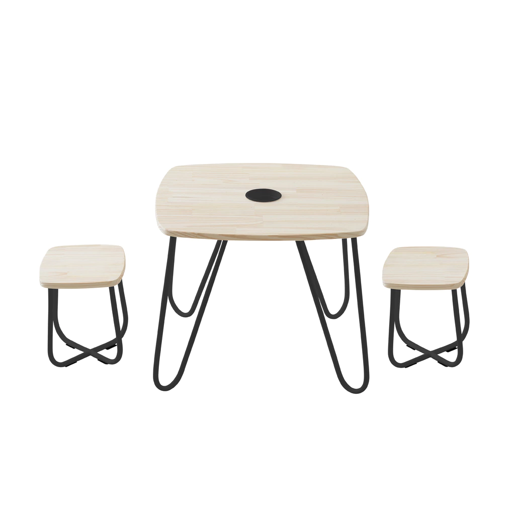 Produzido em madeira pinus natural, o kit combina resistência e leveza, enquanto os pés em metal com acabamento colorido trazem um toque divertido e moderno ao ambiente. No centro da mesa, o porta-lápis metálico, na mesma cor dos pés, mantém tudo organizado e sempre à mão, estimulando autonomia e praticidade no dia a dia.