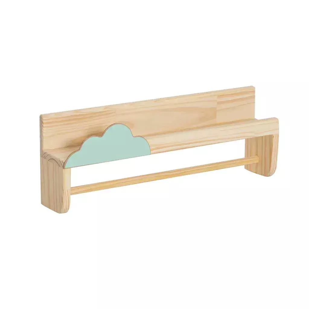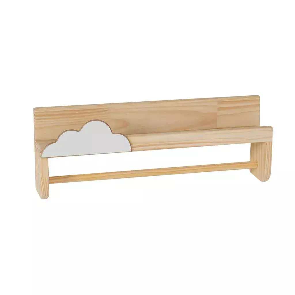 Prateleira com varão feita em madeira Pinus com laminado decorativo em formato de nuvem.
